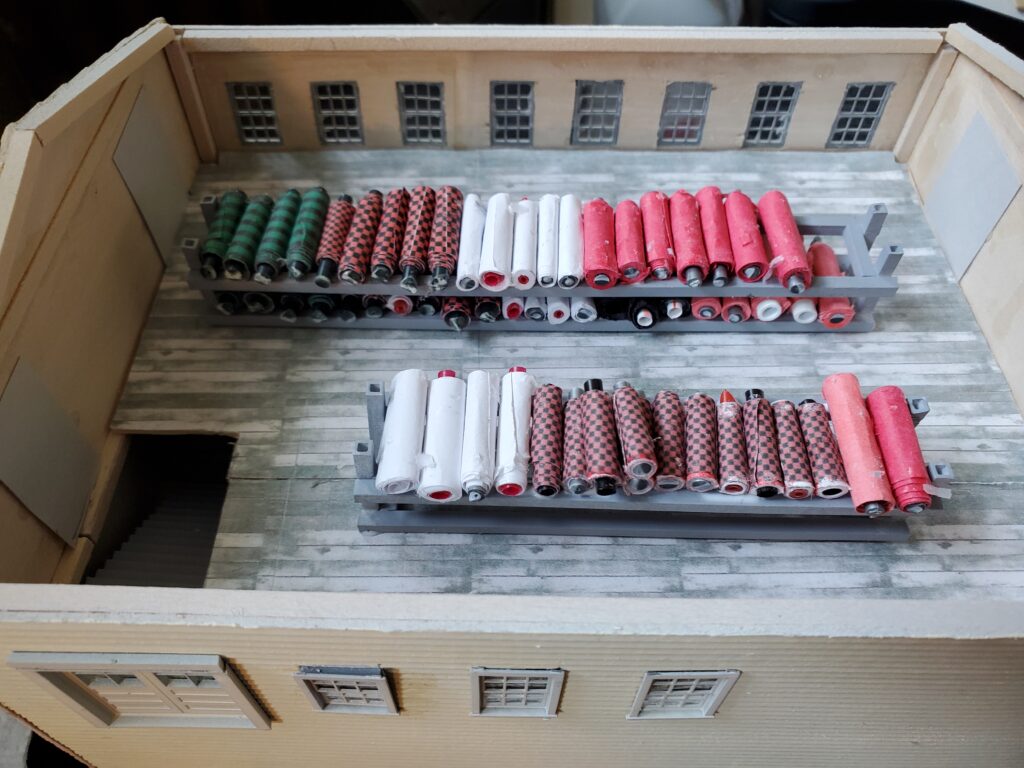 I have been working on the woolen mill building. I am working on Building one interior. I decided the first/ground floor would have no longer been used as it has flooded in the past and therefore only used for certain machinery. I have therefore been working on the second floor and have created racks for the rolls of wool and cloth. I decided that there would also be a table where the fabric is cut down into patterns of the clothing that will be made into jackets and etc. I also installed the stairway going down to the first floor. There is a stairway from the third floor landing on this second floor but I will wait and install that later. Here is a picture of the floor