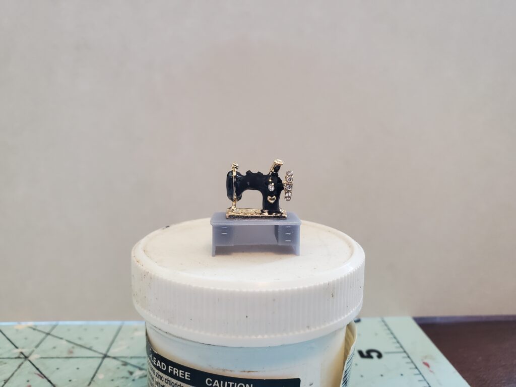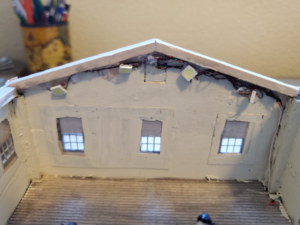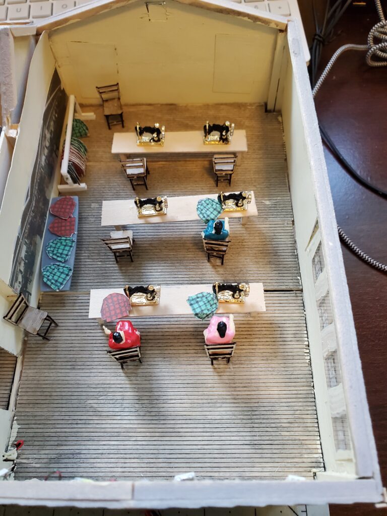 I haven’t had a lot of time lately do work on the woolen mill but have added lights to the buildings. The first set of lights I added did not light up enough, so I had to get some larger ones. I got my lights from Evans Design. They are led’s all prewired with four lights all tied together so only one lead wire is needed to hook up. I am also working on creating a new adapter for plugging the lights into a adapter with a wall wart, therefore doing away with the battery setup I used on the other buildings. I found the battery setup is ok is not used often but break too easily if used over and over. I plan to have the adapter box made so up to eight buildings can be plugged in. I will add a picture of that when its finished. For now I have found some miniture sewing machines and purchased them. They are a little large for HO scale but the only ones I could find.