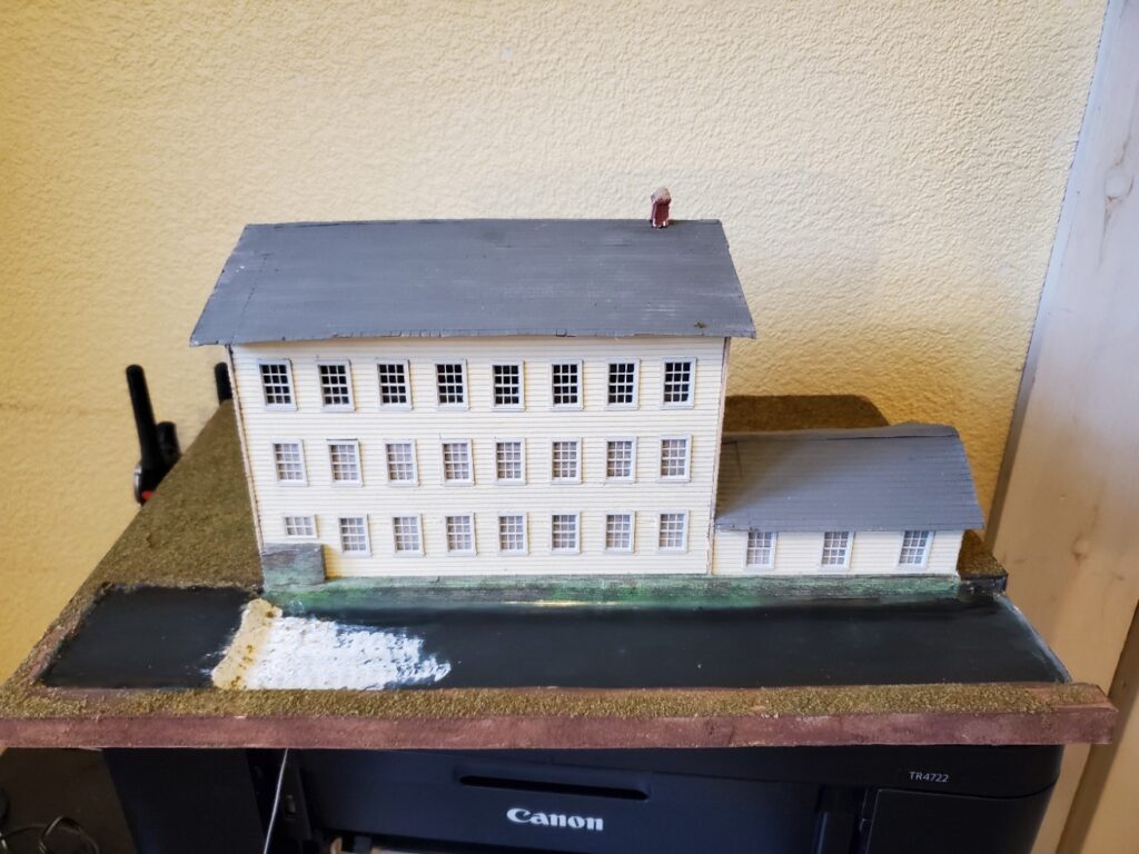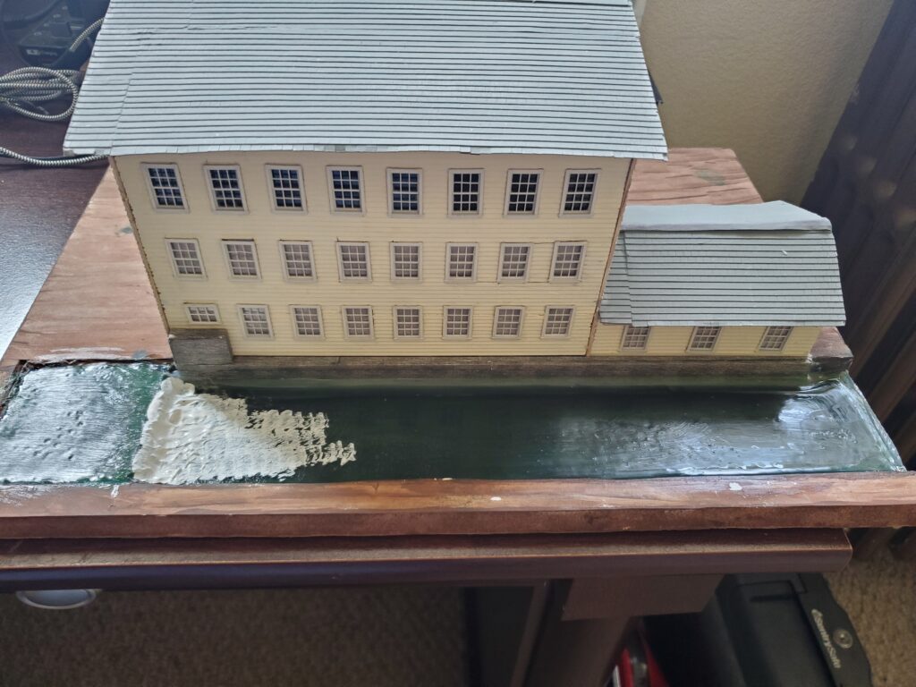 August 3, 2025; The picture you see on the left is about the river that flows alongside of the Johnson Woolen Mill building. The white area is a waterfall that used to be a dam however has been broken down and no longer used as such. I use Realistic water to cover my river’s after I have painted the bottom the colors I want. I like to mix black, blue and green leaving a greenish color for the river. I also used Woodland Scenics water effects to create the ripples and waves on the waterfall. After all that is dry I paint the waves and ripples with white. I have not glued the building down yet as I still need to add a plug on the end of the light wire that I have ran through the base. That plug will end up being plugged into my junction box which will light the building.